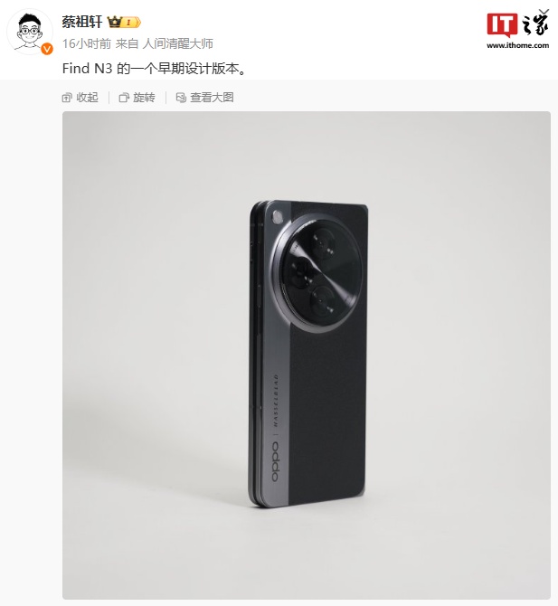 IT之家 9 月 22 日消息,OPPO Find N3 折叠屏手机早期设计版本昨晚(9 月 21 日)在微博被 @蔡祖轩 曝光,新机采用了与在售机型不同的拼接设计,保留了圆形相机模组。
