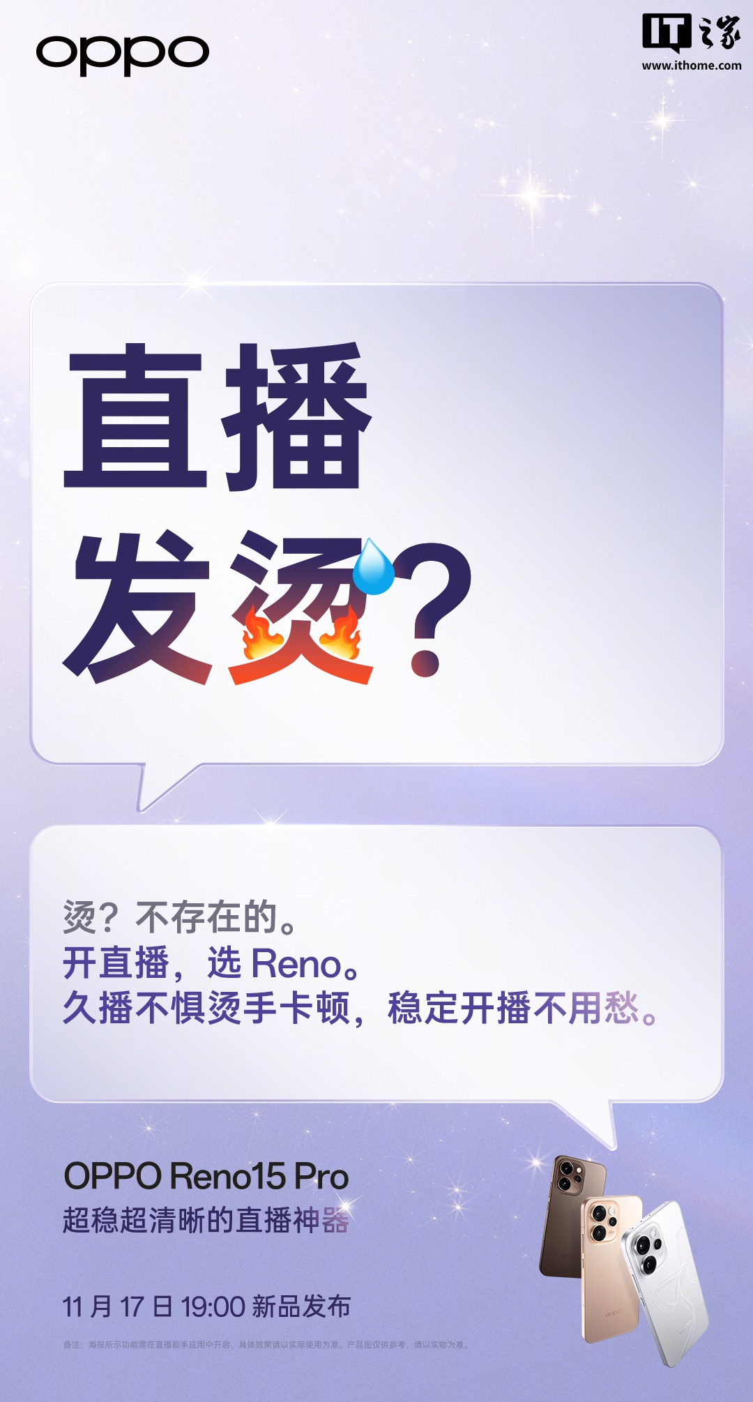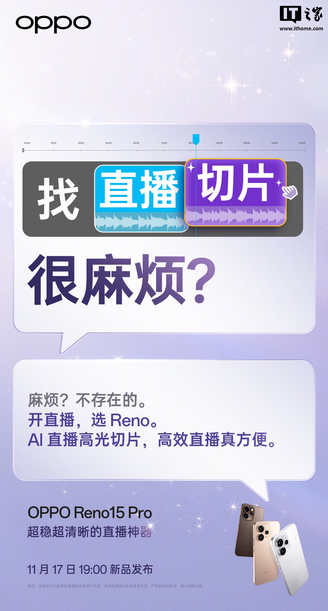 根据 OPPO 官方今天发布的预热,Reno 15 Pro 手机将支持“AI 直播高光切片”,可自动整理直播片段,宣称“久播不惧烫手卡顿、前置后置都给力”。