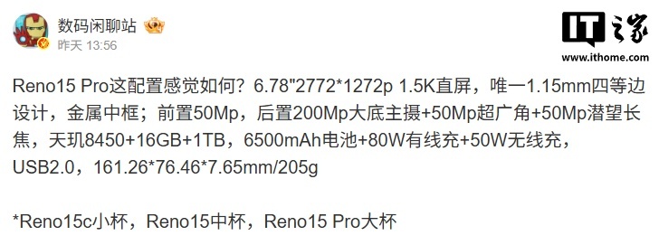 结合IT之家此前援引 @数码闲聊站 消息,OPPO Reno 15 Pro 手机将搭载 6.78 英寸 1.5K 直屏,分辨率是 2772*1272,内置 6500mAh 电池,支持 80W 有线充 +50W 无线充,配备天玑 8450 处理器,最高可选 16GB 内存 +1TB 存储空间。
