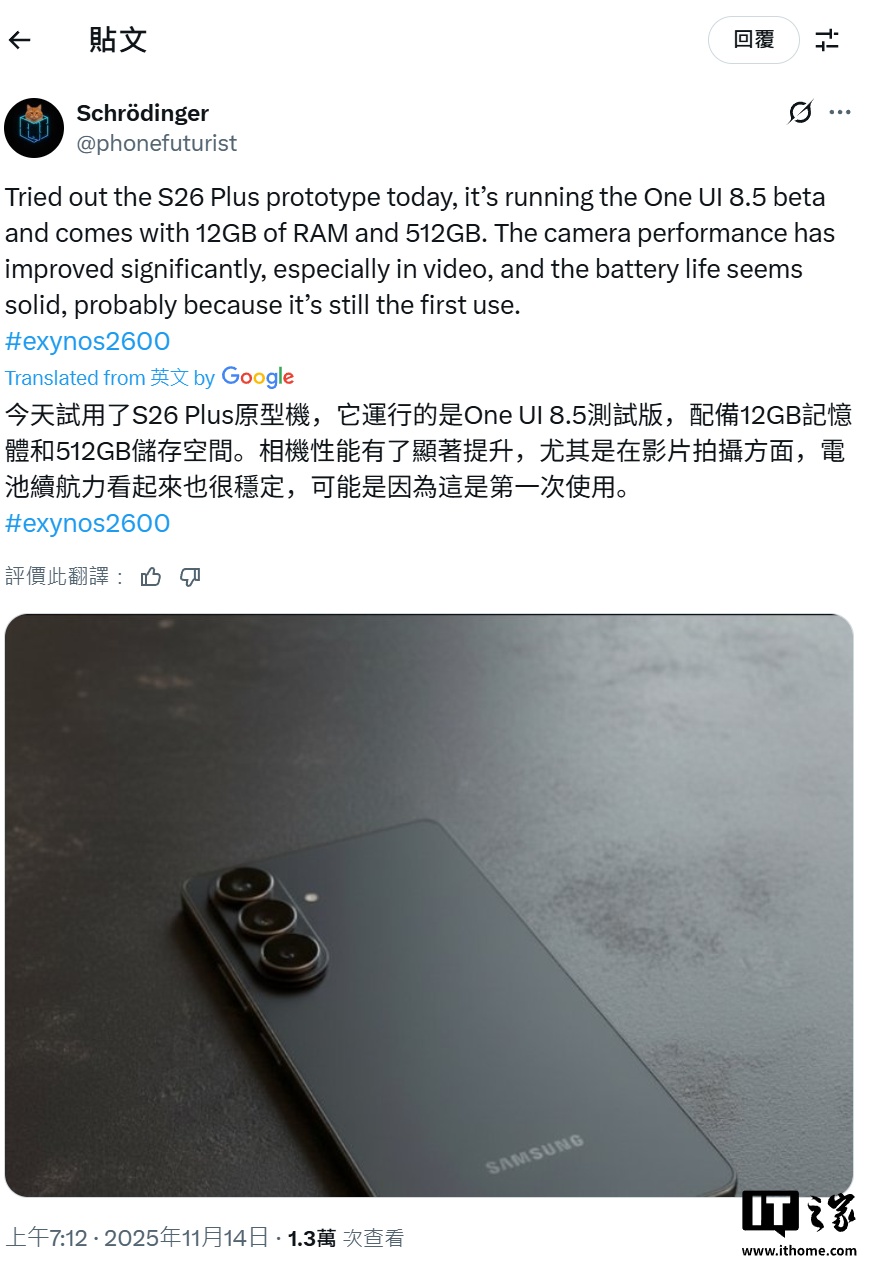 IT之家 11 月 14 日消息,消息人士 Schrödinger 今天在 X 平台发文,曝光三星 Galaxy S26+ 手机的实拍图及软硬件参数。