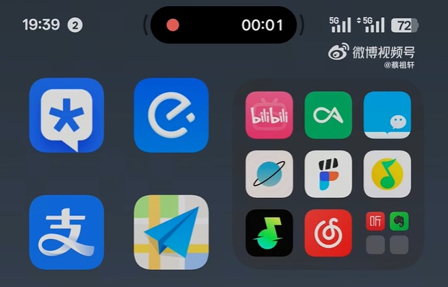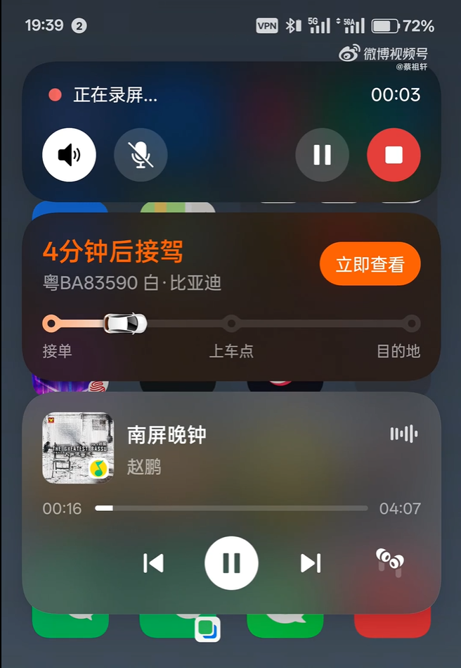 可以看到,流体云位置改为居中,类似苹果的“灵动岛”,演示中出现了录屏、音乐播放以及打车软件的界面。