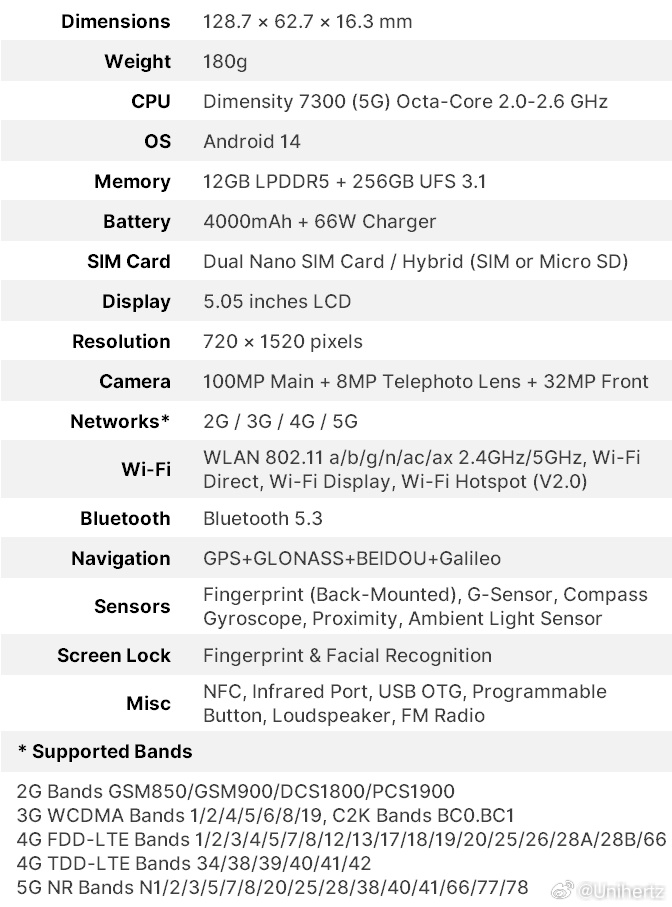 据介绍,Unihertz Jelly Max 手机搭载一块 5.05 英寸 1520 x 720 分辨率的 LCD 打孔屏,机身三围 128.7 x 62.7 x 16.3mm,重 180g,官方曾经放出过 Jelly Max 与 iPhone 13 mini 的真机尺寸对比。