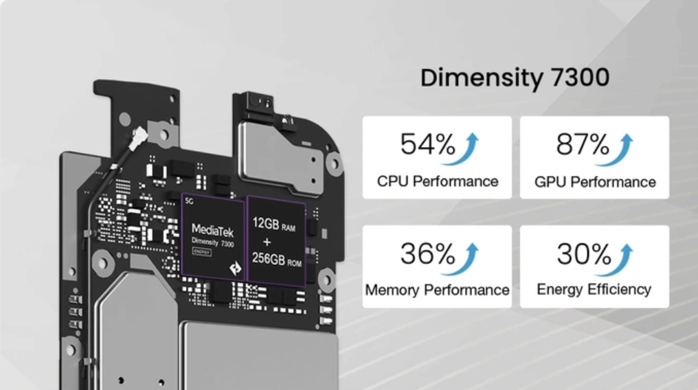 性能方面,Jelly Max 搭载天玑 7300 处理器(2.5GHz 4x A78 + 4x A55、Mali-G615 MC2、4nm 制程)与 12GB LPDDR5 RAM + 256GB UFS 3.1 存储空间的组合,性能相比前代的 Helio G99 大幅提升。