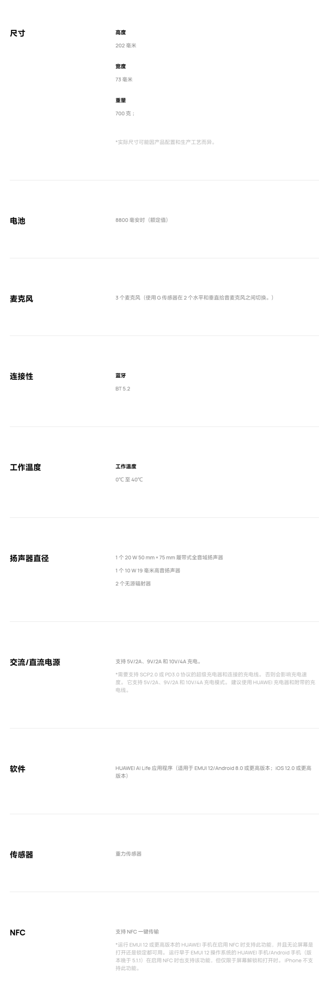 华为 Sound Joy 2 配备 4 单元 HUAWEI SOUND 系统,包含 20W 全频扬声器、10W 高音扬声器、2 个无源辐射器,高音扬声器采用丝质振膜,可提供 20kHz 高音。