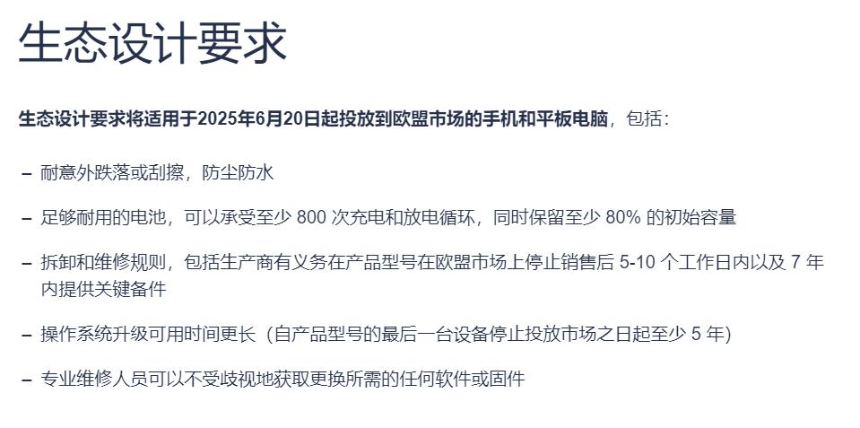 而生态设计法规,要求手机和平板设计时耐摔耐刮,防尘防水;电池在经过 800 次充放电循环后,最大容量不低于 80%;厂商在停止销售后 7 年内提供关键零部件,且必须在 5-10 个工作日内及时提供;产品发售后 5 年内提供系统更新等……