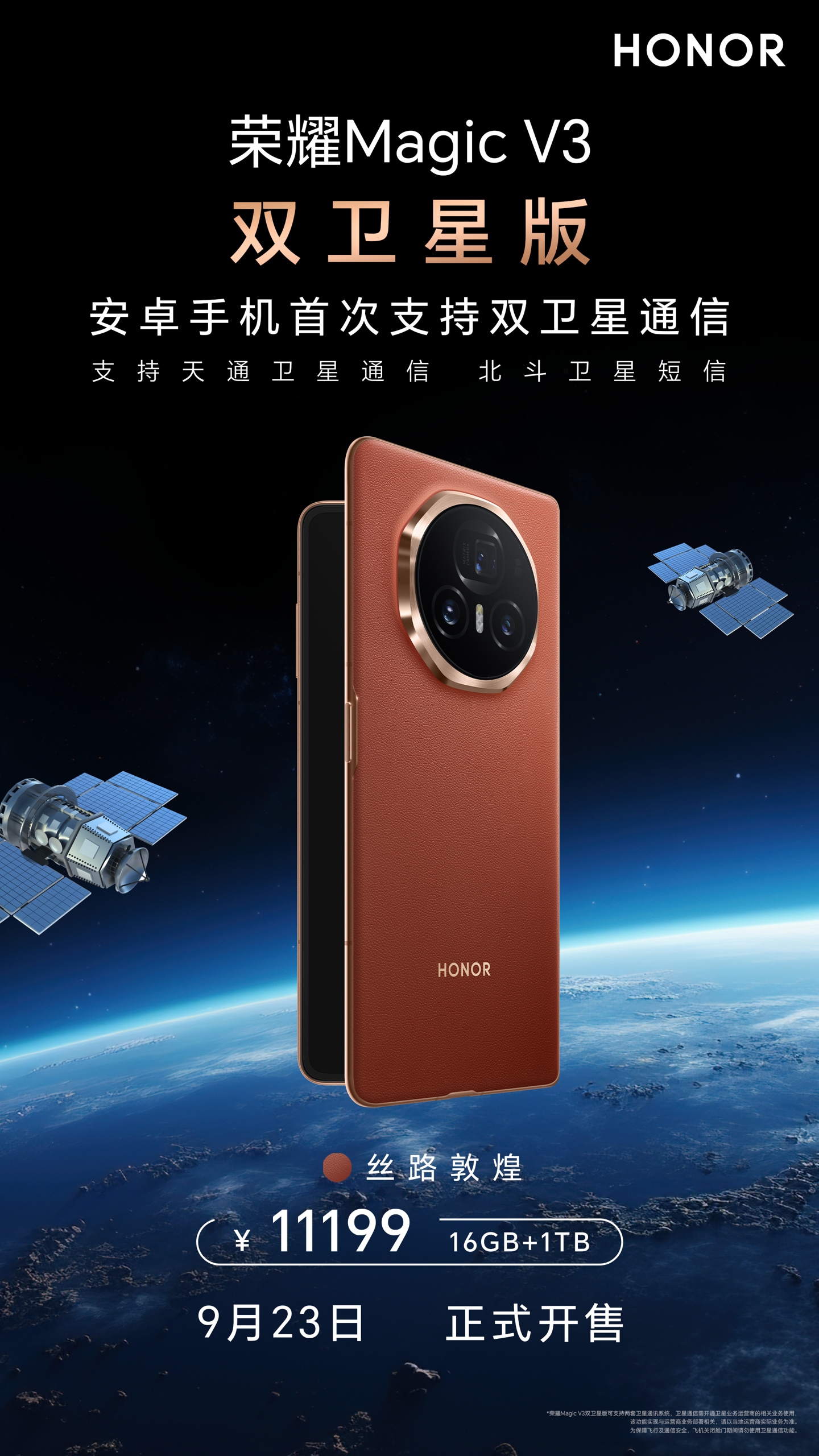 IT之家 9 月 23 日消息,荣耀今日官宣推出 Magic V3 双卫星版手机,海报显示“安卓手机首次支持双卫星通信”,新机 16GB + 1TB 定价 11199 元,今日正式开售。