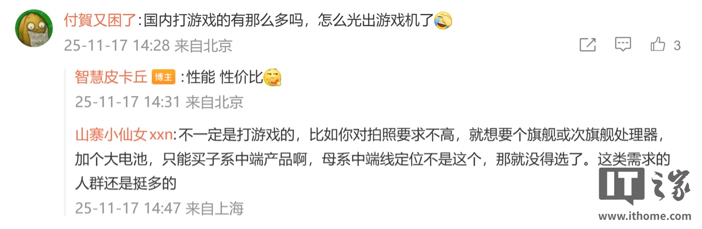 后续有用户在评论区询问:“国内打游戏的有那么多吗,怎么光出游戏机了”,博主回复道:“性能性价比”;另一名用户则询问道:“大 R 还是小 r”,博主则回复道:“小”。