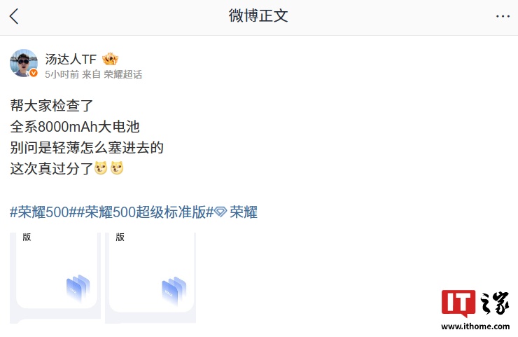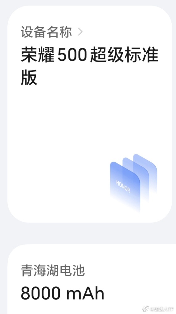 荣耀产品经理 @汤达人TF 今日分享图片,并宣布荣耀 500 系列新机全系采用 8000mAh 大电池。另外,新机的设备名称分别是荣耀 500 超级 Pro 版、荣耀 500 超级标准版。