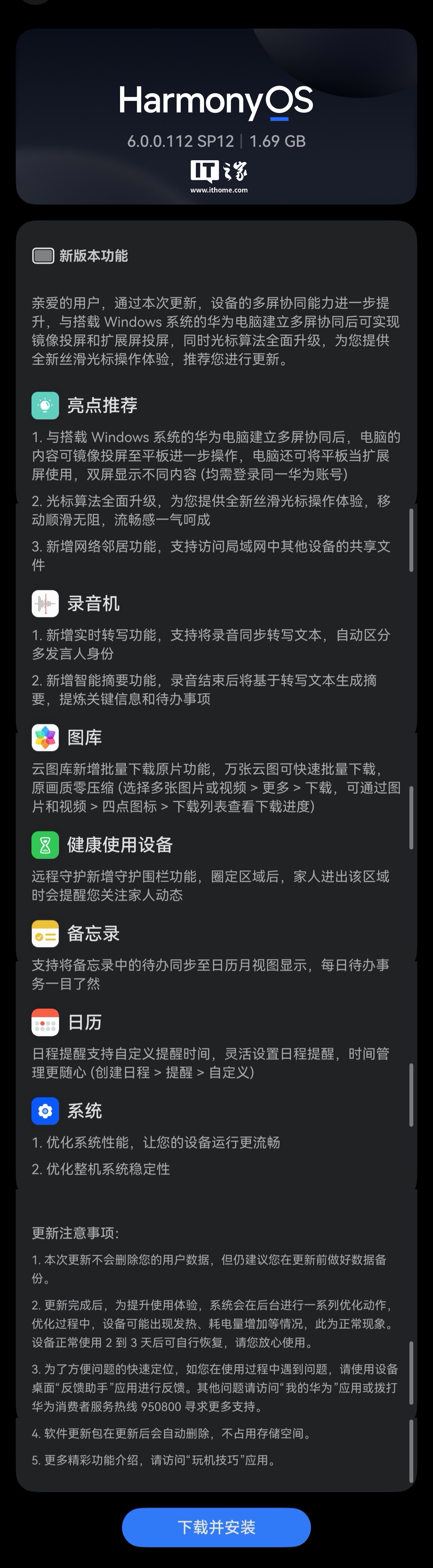 IT之家 11 月 18 日消息,华为 MatePad 系列平板今日也同步开启鸿蒙 HarmonyOS 6.0.0.112 SP12 版本升级,首批适配设备包括 MatePad Pro 12.2 英寸 2025 款、MatePad Pro 13.2 英寸 2025 款等。通过本次更新,平板设备的多屏协同能力进一步提升,PC 多屏协同功能正式回归。