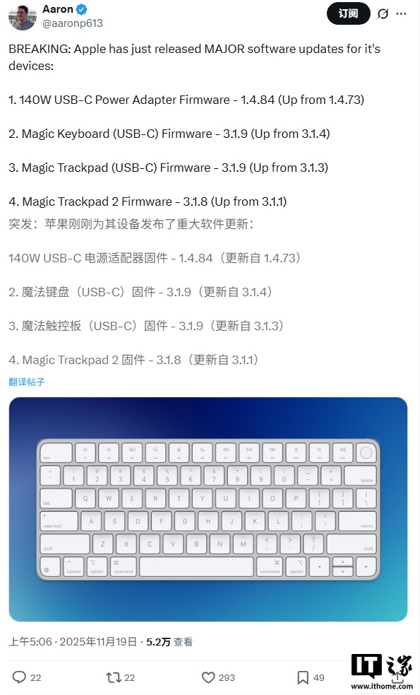 IT之家 11 月 19 日消息,Aaron 发现,苹果今日为妙控键盘、妙控板、140W USB-C 电源适配器等多款外设推送了固件更新。另外,苹果今天同时还发布新的 AirPods Pro 3 测试版固件(8B5025a),但都没有详细更新说明。