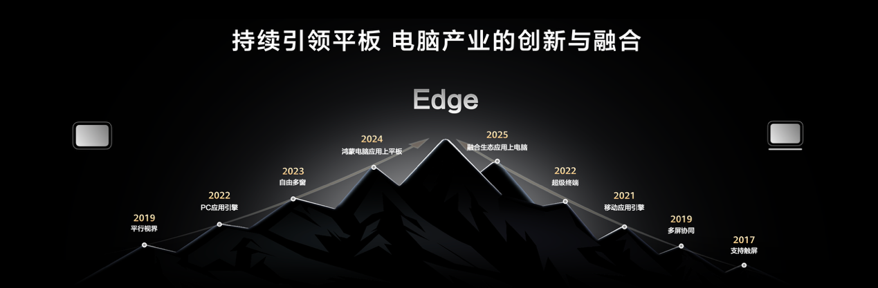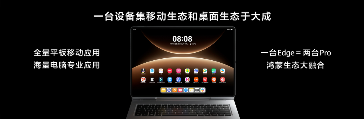 其次,在生态融合上,华为 MatePad Edge 基于鸿蒙系统,实现了双模式下鸿蒙平板与鸿蒙电脑的双生态融合,既满足移动娱乐,也能提供专业办公生态,让用户体验两种设备协同后的极致创造力与生产力。
