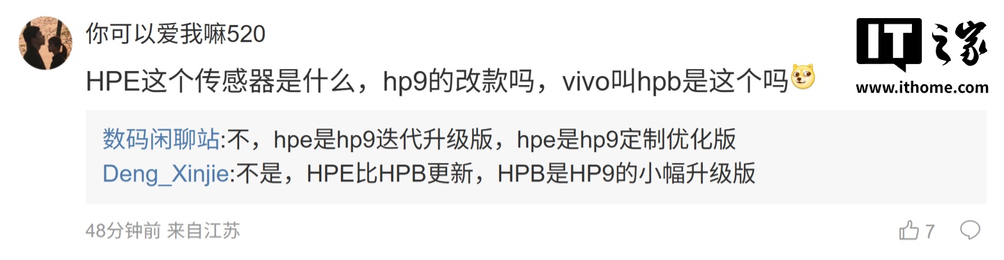 后续有用户在评论区询问:“HPE 这个传感器是什么,hp9 的改款吗,vivo 叫 hpb 是这个吗 ”,博主回复道:“不,hpe 是 hp9 迭代升级版,hpe 是 hp9 定制优化版”;另一名用户则询问道:“啥时候能全部用上一英寸的大底传感器”,博主则回复道:“一英寸超大杯都很罕见了”。