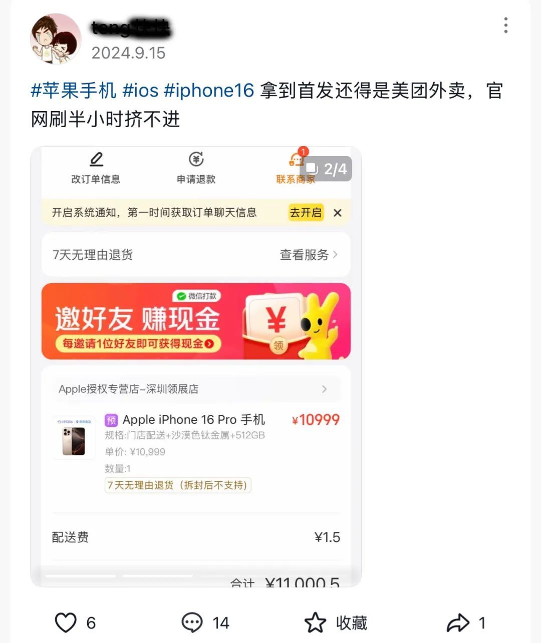这套巧妙的“高端玩法”,并非一线城市消费者的专属。iPhone 16发售当天上午10点,内蒙古鄂尔多斯的一位消费者在商家门店下单,仅等待10分钟,就从外卖骑手手中收到了iPhone 16 Pro Max。
