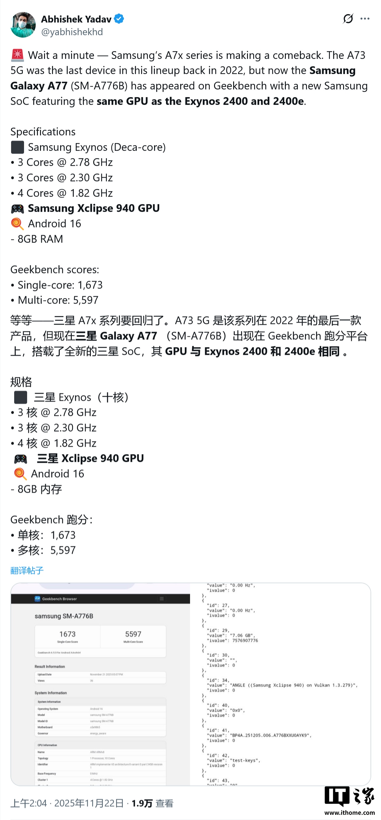 IT之家 11 月 22 日消息,消息源 @yabhishekhd 今天(11 月 22 日)发布博文,报道称三星有望重启 Galaxy A7x 系列,新机 Galaxy A77 在 Geekbench 跑分平台现身。
