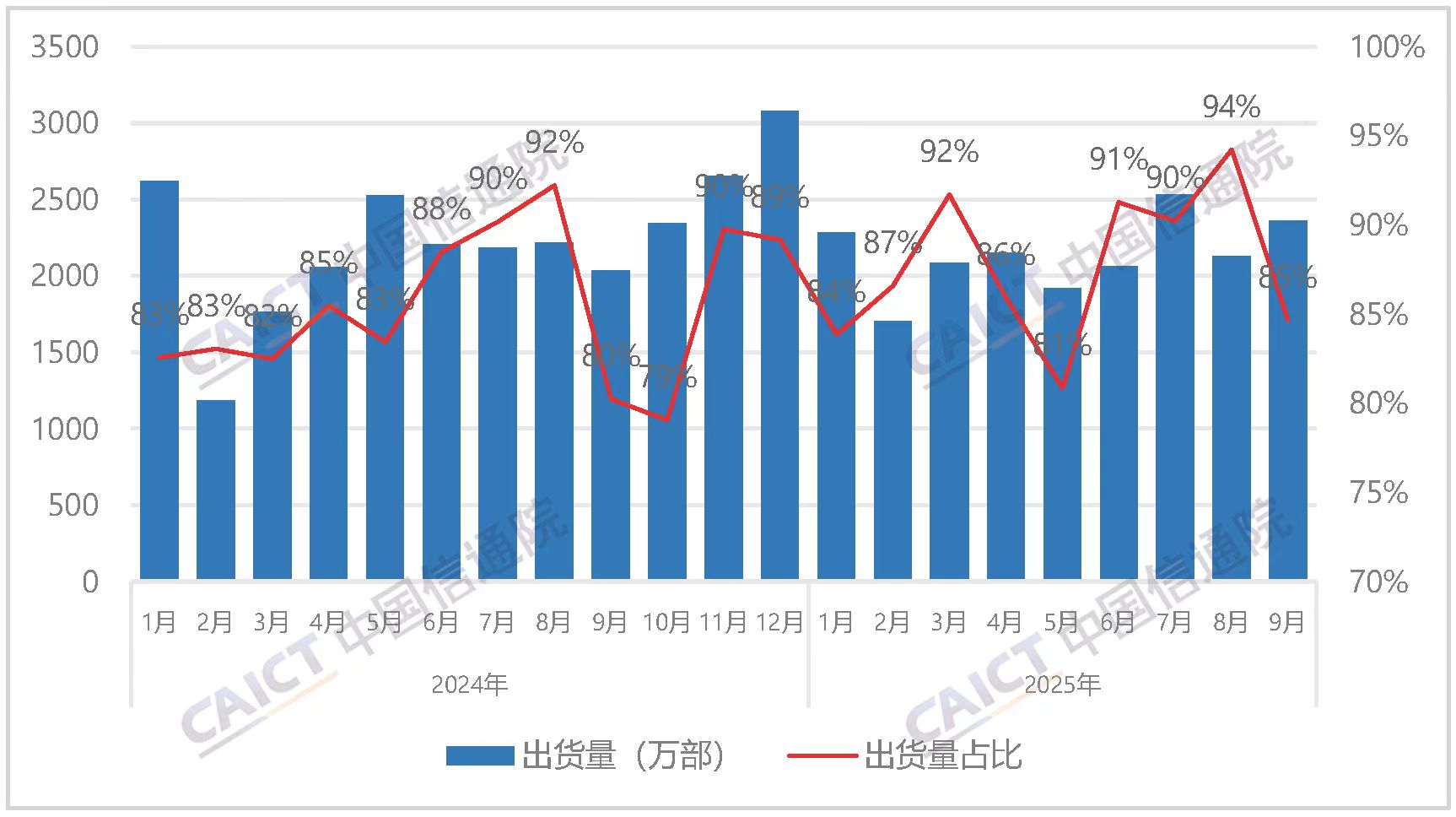 11月20日,中国信息通信研究院发布《2025年9月国内手机市场运行分析报告》称,当月国内手机市场出货量为2793.1万部,同比增长10.1%。其中,5G手机出货量2410.6万部,同比增长8.0%,在整体出货中的占比达86.3%,5G机型仍是市场主力。
