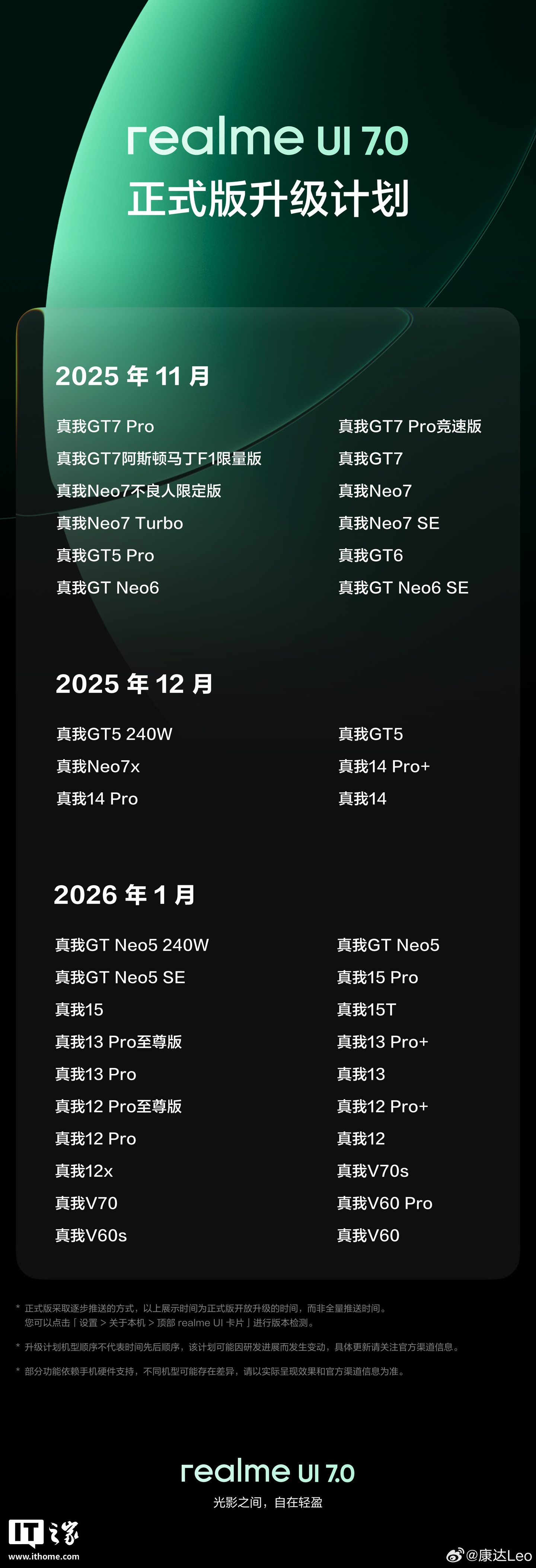 IT之家 11 月 23 日消息,realme UI 产品经理 @康达Leo 昨日发文宣布,realme UI 的 11 月正式版推送马上到来,真我 GT7 Pro、真我 GT7 Pro 竞速版手机的新系统已陆续推送。