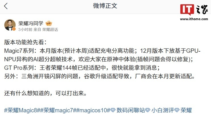 荣耀游戏研发工程师 @荣耀冯同学 此前还透露了 MagicOS 未来版本的部分新功能,其中包括荣耀 GT Pro 系列手机正在适配《王者荣耀》144 帧。