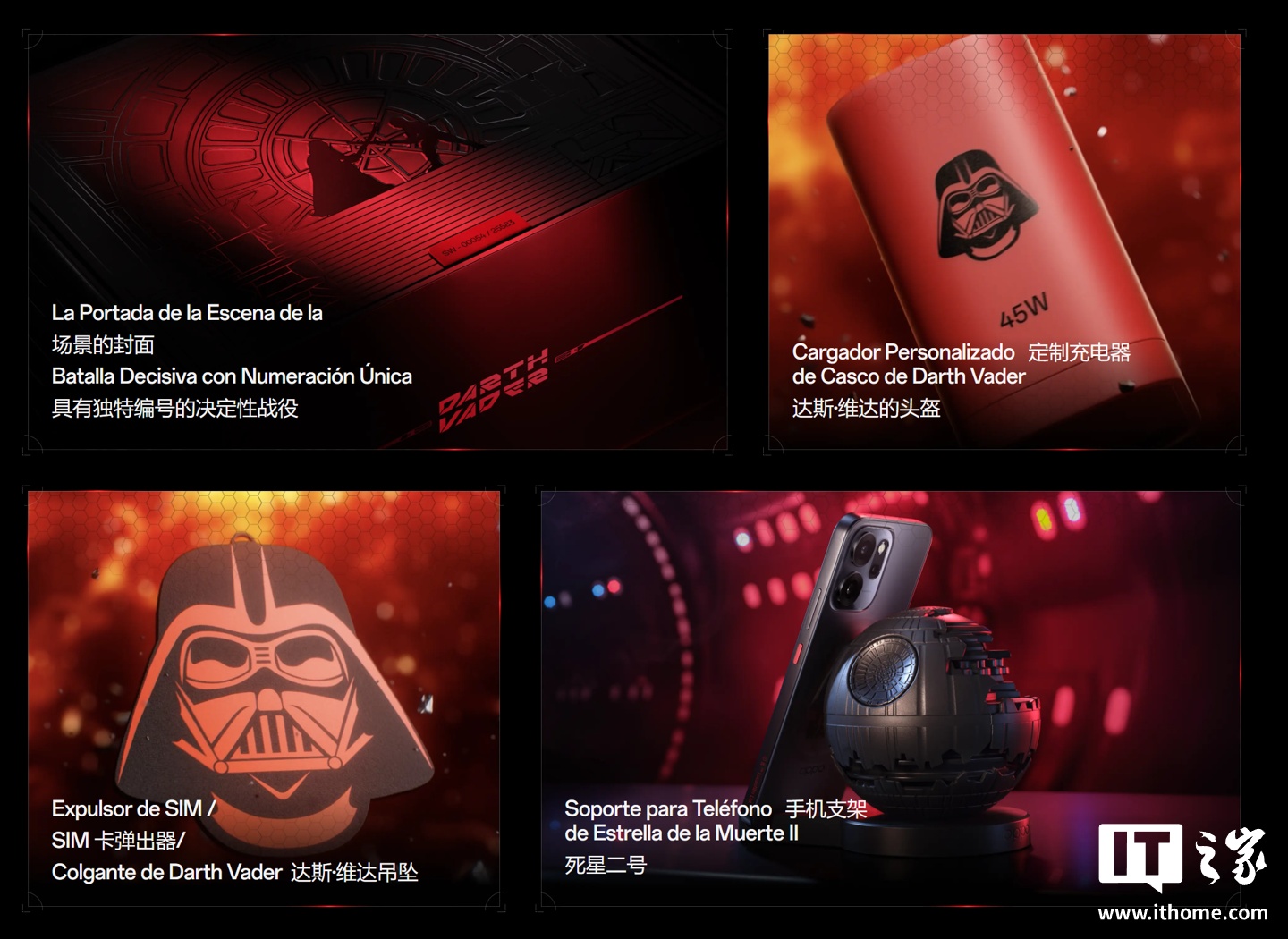 这款手机的包装盒、配件均带有《星球大战》元素,配备红色透明手机壳、同色系充电线、充电器,包装内部满载电影场景,SIM 卡针则是有达斯・维德的大头,还自带有一个死星二号手机支架。
