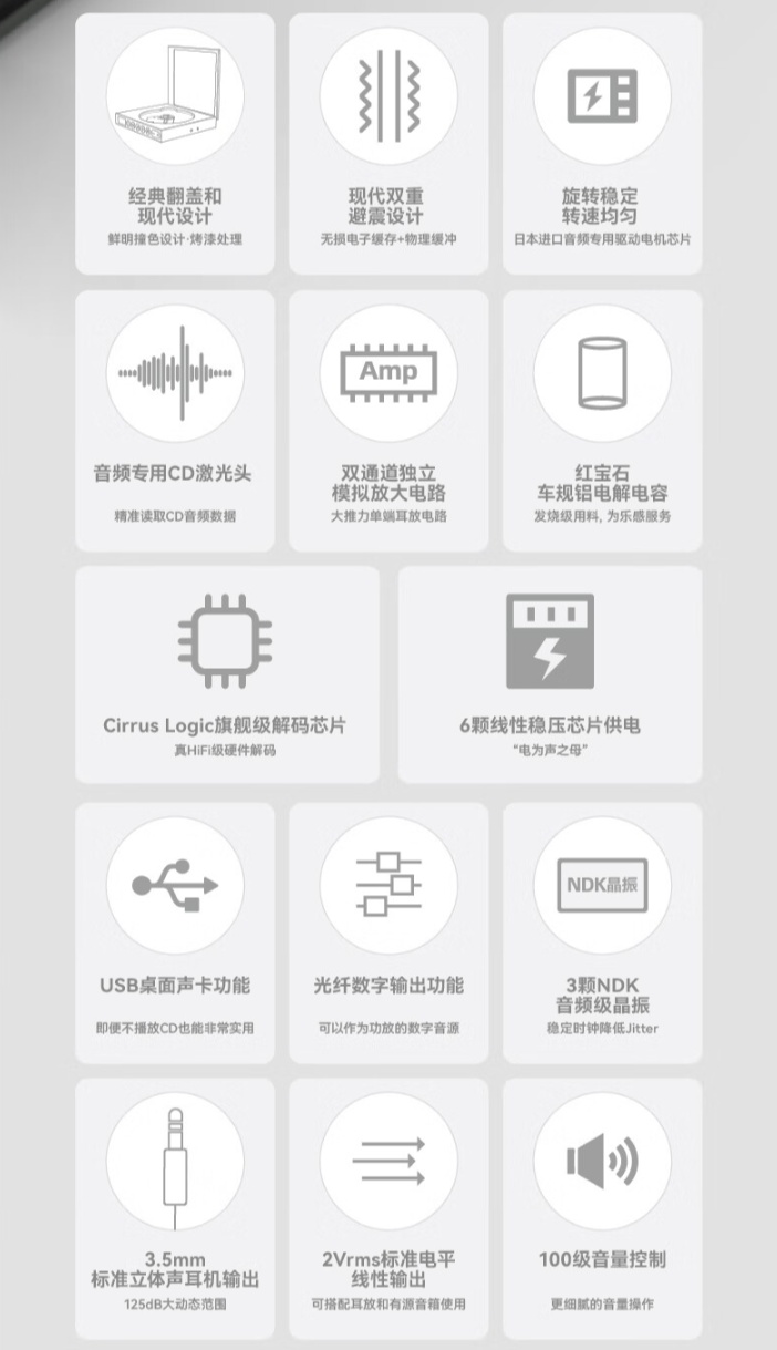 该播放机搭载电机驱动芯片,配备音频专用 CD 光头,辅以双重避震(数据缓存电路的电子缓存和弹性阻尼物理缓冲相结合)。播放机内置 Cirrus Logic 旗舰级 32 位 MasterHIFI 音频解码芯片 、6 颗线性稳压芯片独立供电。