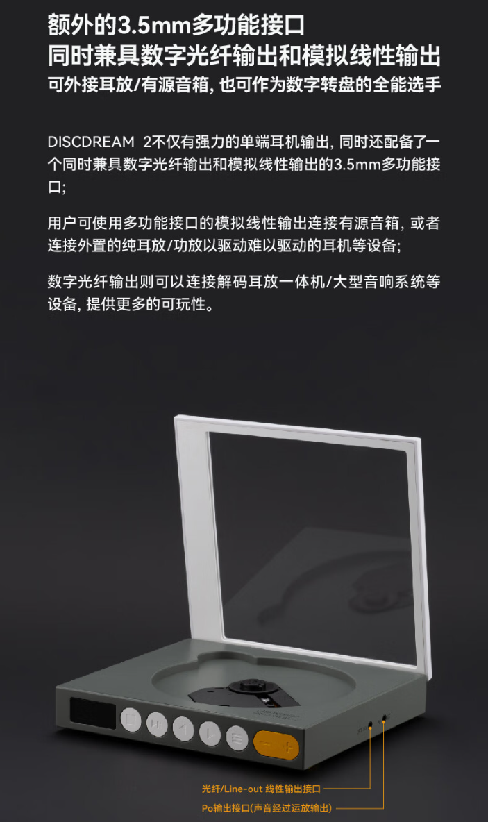 该播放机还配备一个额外 3.5mm 多功能接口,兼具数字光纤输出和模拟线性输出,可外接耳放 / 有源音箱,也可作为数字转盘。此外,该播放机还可作为桌面 USB 声卡,支持硬件解码 32Bit / 384kHz 与 DSD256 音源(适配 Windows / macOS)。