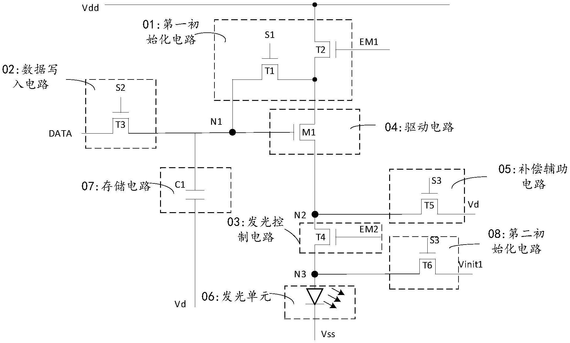 本申请提供一种显示装置、像素电路及其驱动方法,该方法包括:第一初始化电路,与第一节点、第一扫描信号端第一电压端、第一控制信号端以及驱动电路的输入端连接;数据写入电路,与数据线、第一节点和第二扫描信号端连接;发光控制电路,与驱动电路、第二控制信号端和发光单元连接;驱动电路,与第一节点、第二节点、第一初始化电路以及发光控制电路连接;补偿辅助电路,与第二节点、第三扫描信号端和第二电压端连接,用于在第三扫描信号端提供的第三扫描信号的控制下为第一节点写入阈值电压和第二电压端提供的第二电压以及为第二节点写入第二电压。本申请实现了对驱动晶体管阈值电压的补偿,从而提升像素电路的显示稳定性和一致性。