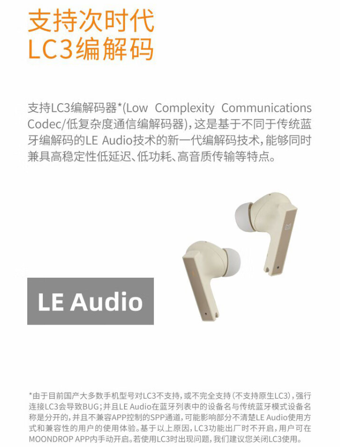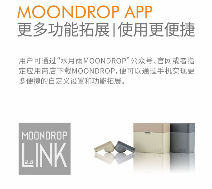 该耳机还支持开盖自动回连、一键进入匹配;耳机充电仓支持无线充电。用户还可通过 MOONDROP App 进行降噪 / 透传切换、自定义设置和功能拓展。