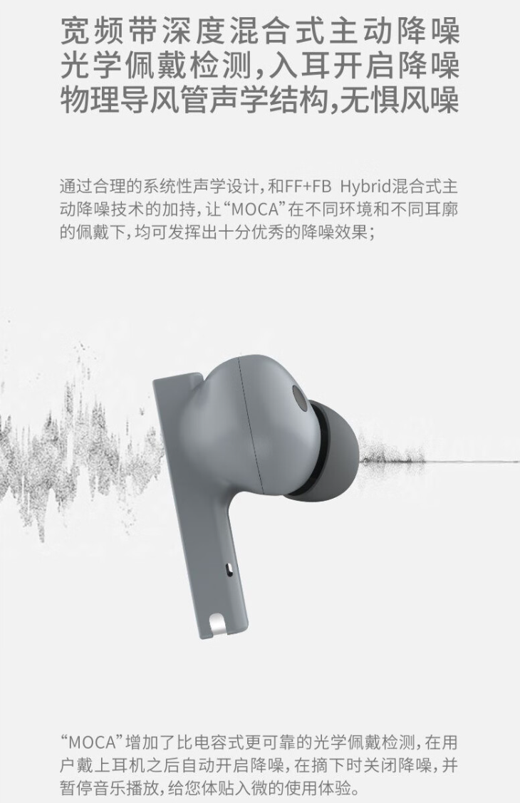 据介绍,水月雨猫咖 MOCA 无线耳机支持“宽频带深度”混合式主动降噪,辅以光学佩戴检测,入耳开启降噪。耳机还拥有物理导风管声学结构,可减少麦克风的风噪产生。