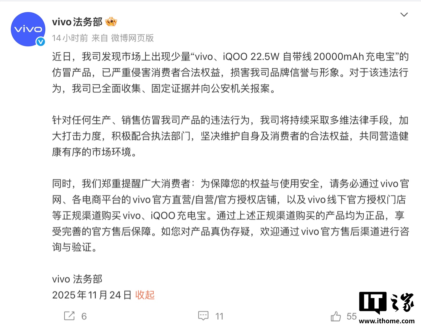 IT之家 11 月 25 日消息,@vivo法务部 官微昨晚发文称,近日发现市场上出现少量“vivo、iQOO 22.5W 自带线 20000mAh 充电宝”的仿冒产品,已严重侵害消费者合法权益,损害公司品牌信誉与形象。
