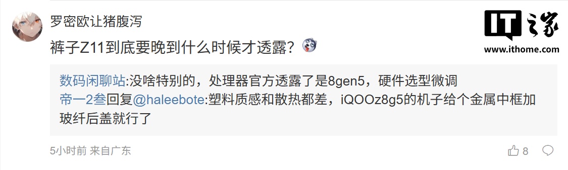 后续由用户在评论区询问:“s50 是不是 8sgen4”,博主回复道:“gen3”;另一名用户则询问道:“裤子 Z11 到底要晚到什么时候才透露?”,博主则回复道:“没啥特别的,处理器官方透露了是 8gen5,硬件选型微调”。