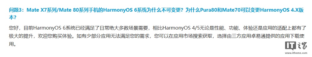IT之家查询获悉,对于“Mate X7 系列 / Mate 80 系列手机的 HarmonyOS 6 系统为什么不可变更?为什么 Pura 80 和 Mate 70 可以变更 HarmonyOS 4.X 版本?”的问题,华为官网进行了解释: