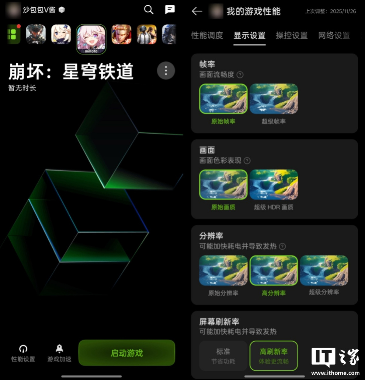 然后是重度负载的《崩坏:星穹铁道》,一加 Ace 6T 首发适配了 972P 的高分辨率,玩家朋友们可以打开游戏助手,选择《崩坏:星穹铁道》,点击左下角性能设置,找到显示设置中的分辨率选项,选择高分辨率开启。