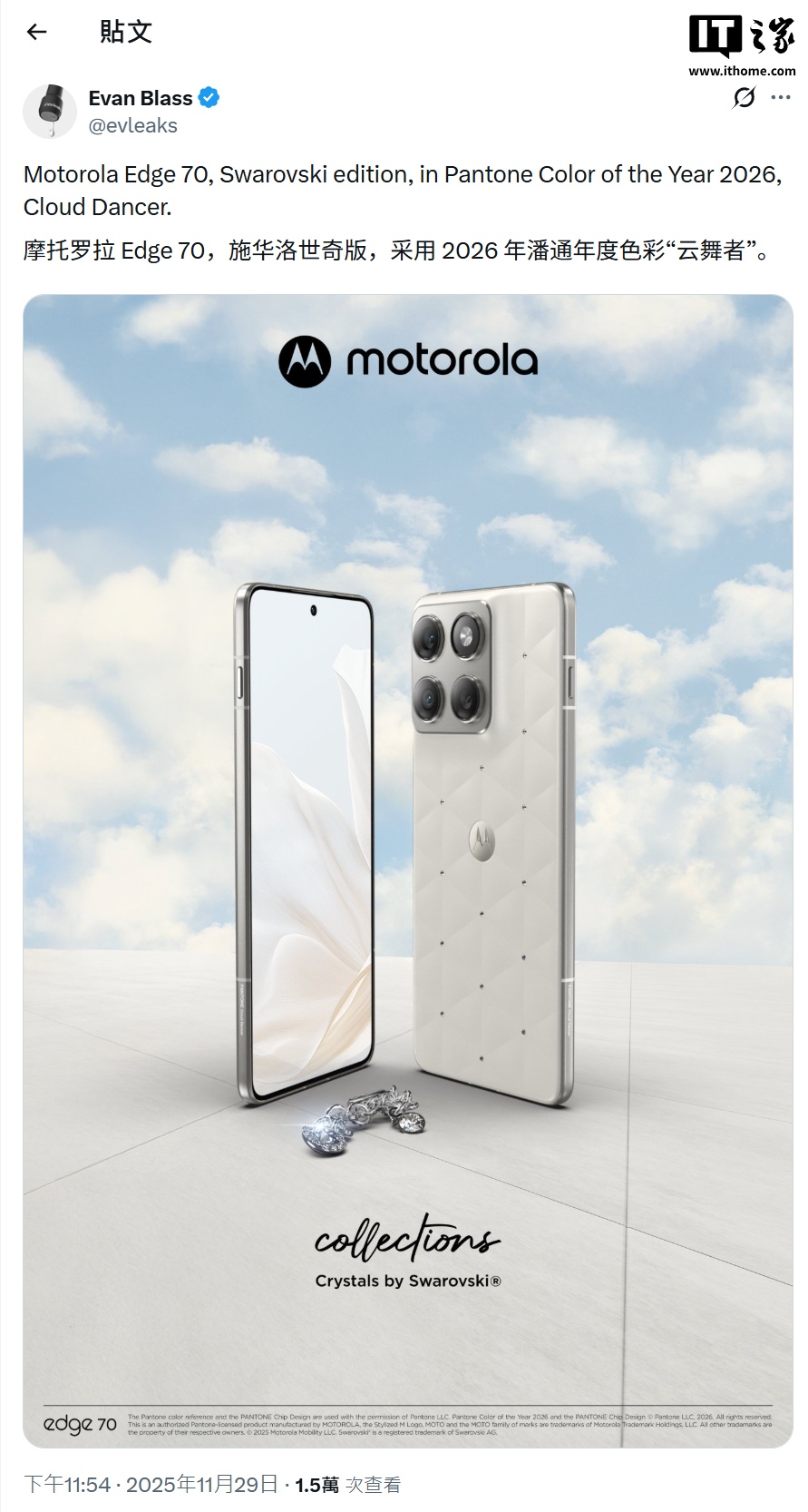 根据消息人士 Evan Blass 上周发布的泄露图,这款特别版的 Edge 70 手机将采用彩通(IT之家注:Pantone)2026 年度代表色,配色本身将被命名为“Pantone Cloud Dancer”(云中舞者),而非之前传闻的“Lightest Sky”。