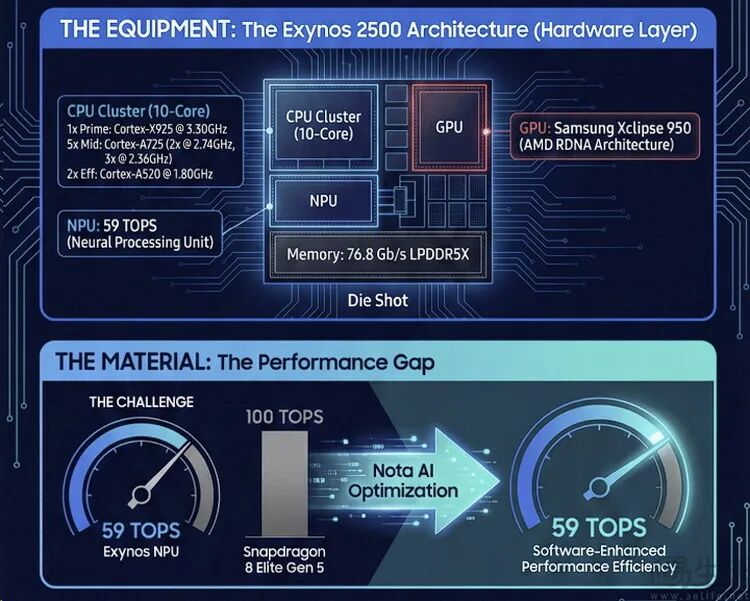 对于更多的品牌来说,与大模型进行技术合作,深度调校AI功能在NPU上的兼容性和执行速度,也是当下提升NPU性能的主要方式。比如就在最近这几天,三星就与Nota AI达成合作,要通过软件优化的方式让Exynos 2500的NPU(算力59TOPs)在实际AI执行速度上,“追平”第五代骁龙8至尊版上的那颗100TOPs算力NPU。