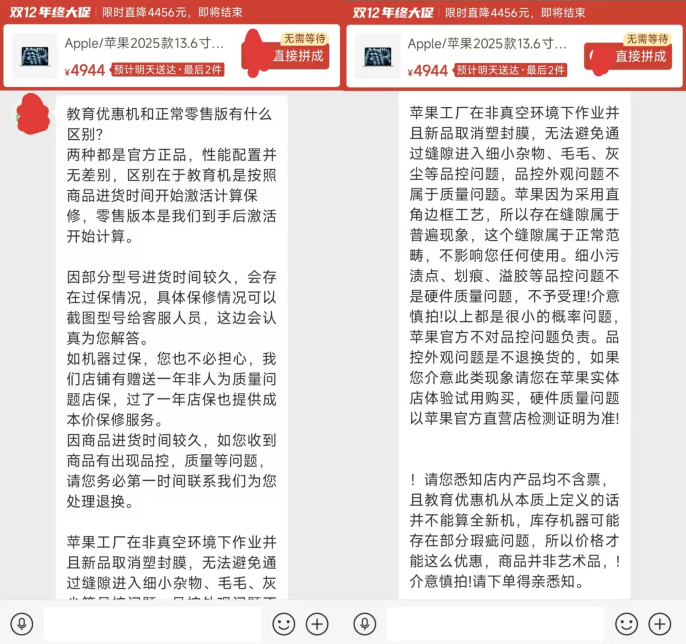 这种就属于比较恶劣的行为了。小雷遇到的所谓「教育优惠机」M4 MacBook Air, 在前台被「包装」成与普通零售机型无异,只有到了客服环节才给告知。