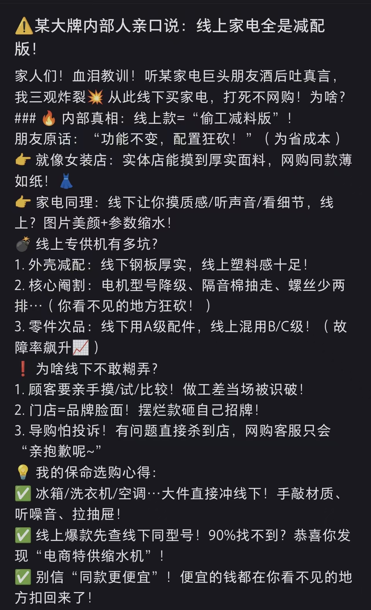 例如,一些主打电商平台的家电产品,即所谓的「电商款产品」,在一些功能和技术上相比同类型线下款的确是有些「配置缩水」,但价格也实打实地比线下款低不少,同时在产品配置参数和商品信息页面也都有呈现,这就不属于「欺诈」。