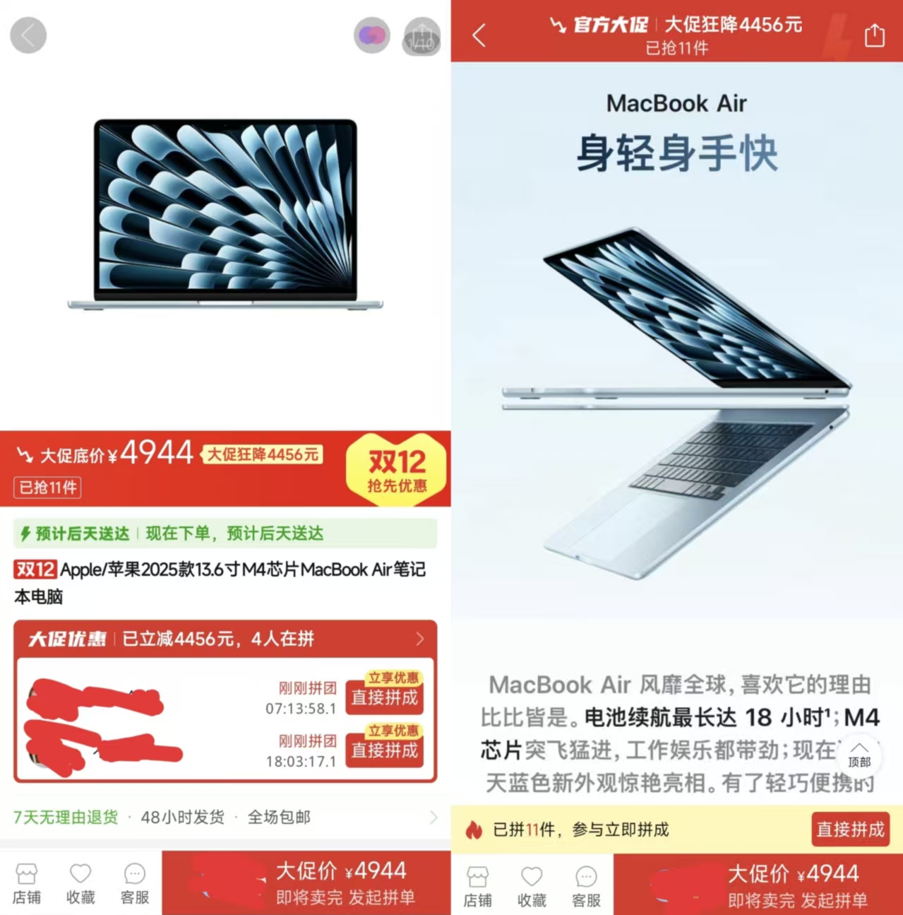 点进去之后,实际下单页面,M4 MacBook Air 入门款(16+256GB)价格的确如上所示,只要 4900 多元,16+512GB 版本只要 6100 多元,24+512GB 版本只要 7300 多元,均比百亿补贴价格还要再低几百块。
