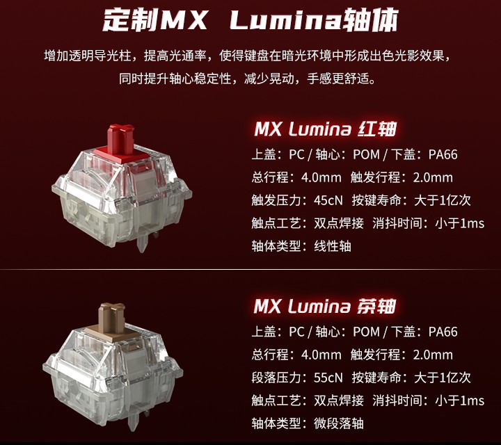CHERRY 的 MX Lumina 轴体目前包含线性红轴和微段落茶轴两个版本,均采用 PC + POM + PA66 的材质组合,按键寿命>一亿次,具体参数如下: