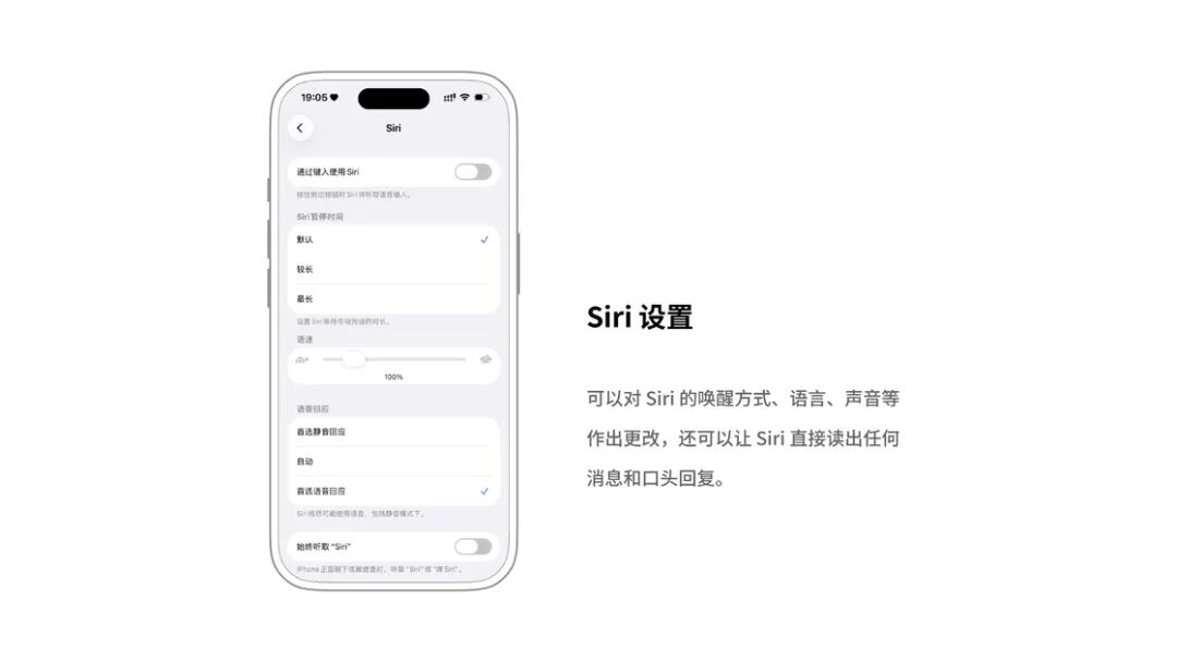 在设置 > Siri 已经可以对 Siri 的唤醒方式、语言、声音等作出更改,还可以让 Siri 直接读出任何消息和口头回复。但是对于 Siri 在什么时候应该发出声音来应答,使用 Siri 时是全屏显示还是仅在底部以及是否通过打字而不是语音来使用 Siri 等设置,都需要进入辅助功能的 Siri 设置页才能改动。