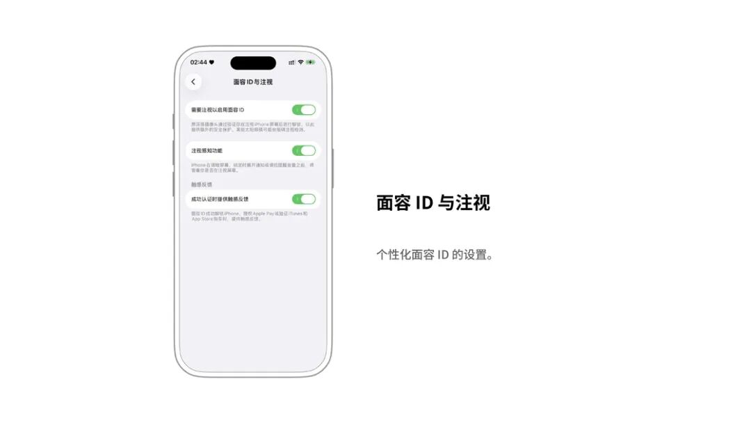 Face ID 的成功识别通常是无感的,而打开此开关后,会在每一次成功识别面部比如解锁屏幕时,除了屏幕上的锁解开,iPhone 也会轻微振动,告知使用者已经成功鉴定面部并解锁。