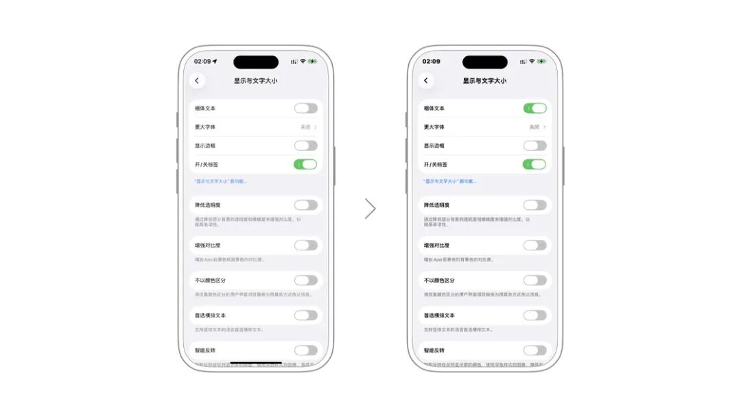 设置 > 辅助功能 > 显示与文字大小中,包含了一系列关于系统文字、图像等显示的设置选项,包括「粗体文本」「更大字体」「按钮形状」「开/关标签」「降低透明度」「增强对比度」「色彩滤镜」「降低白点值」等。