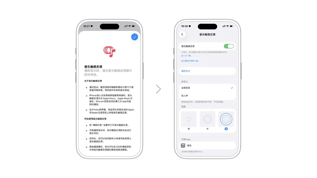 对于听力受损或丧失听力的人群,可以打开「音乐触感反馈」功能。这项功能可以为受到支持的歌曲提供触感反馈,为听障人士提供感受音乐的新方式。你可以在页面下了解更多,并自定义触感反馈的类型和强度。