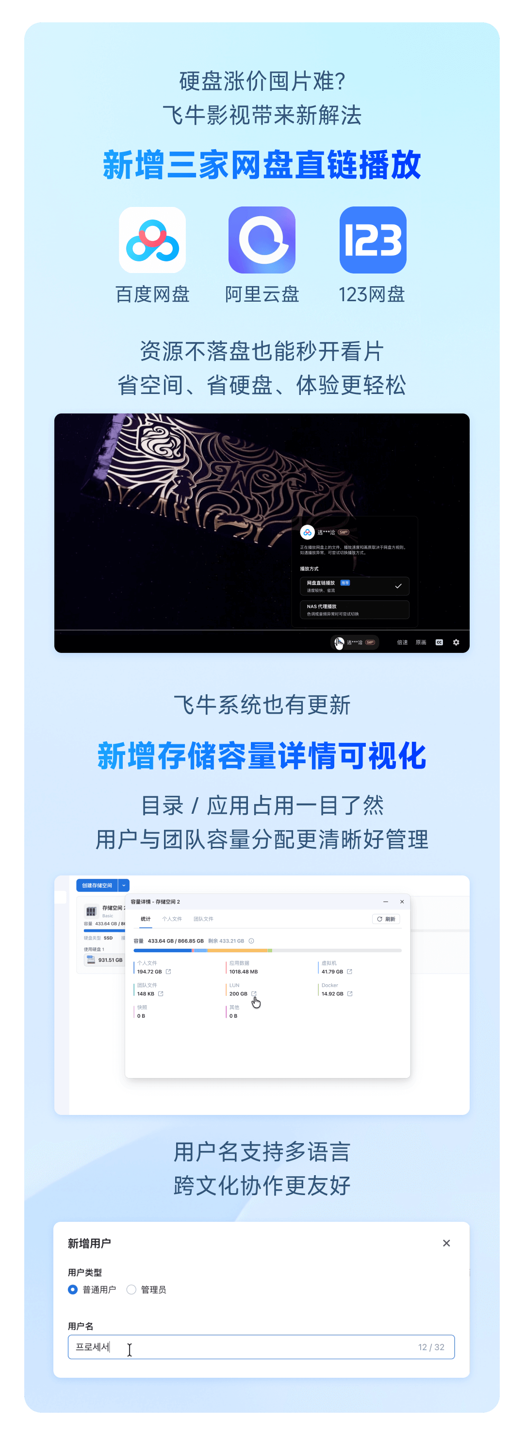 IT之家 12 月 4 日消息,国产 NAS 系统飞牛 fnOS 今日发布了 v1.1.4 更新,新增 3 家网盘直链播放、存储容量详情可视化等。