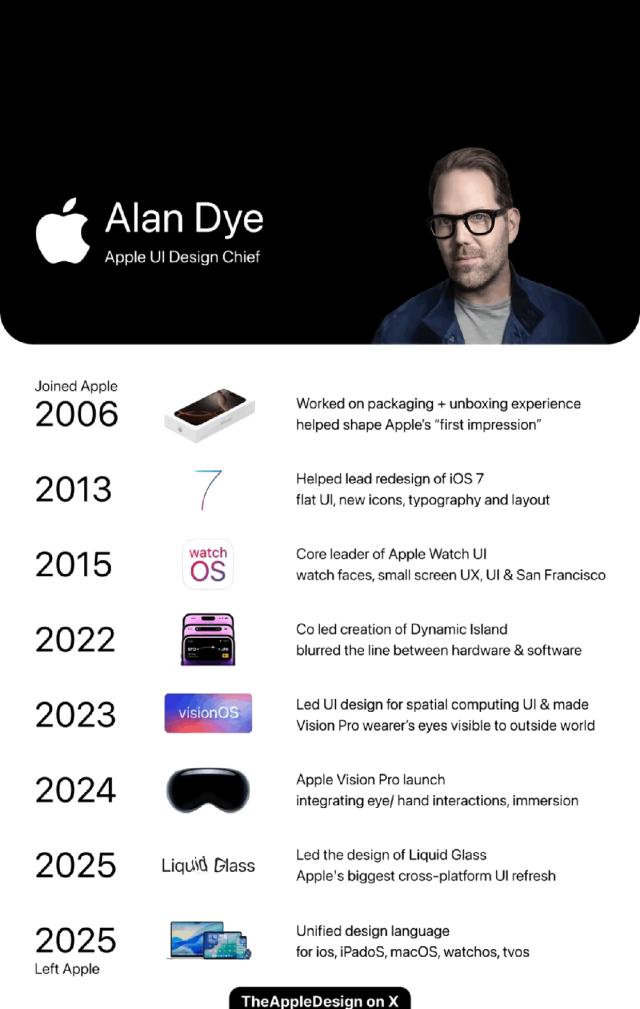今年苹果在WWDC上开启的自iOS 7之后,最大规模UI更新——“液态玻璃”设计语言,也是由其领导设计。