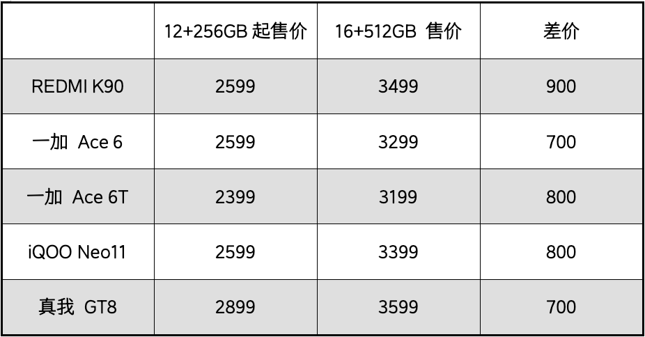 以最近发布的一批中端性能机为例,基本上各家 12+256GB 和 16+512GB 的差价都要去到 700~900 元。