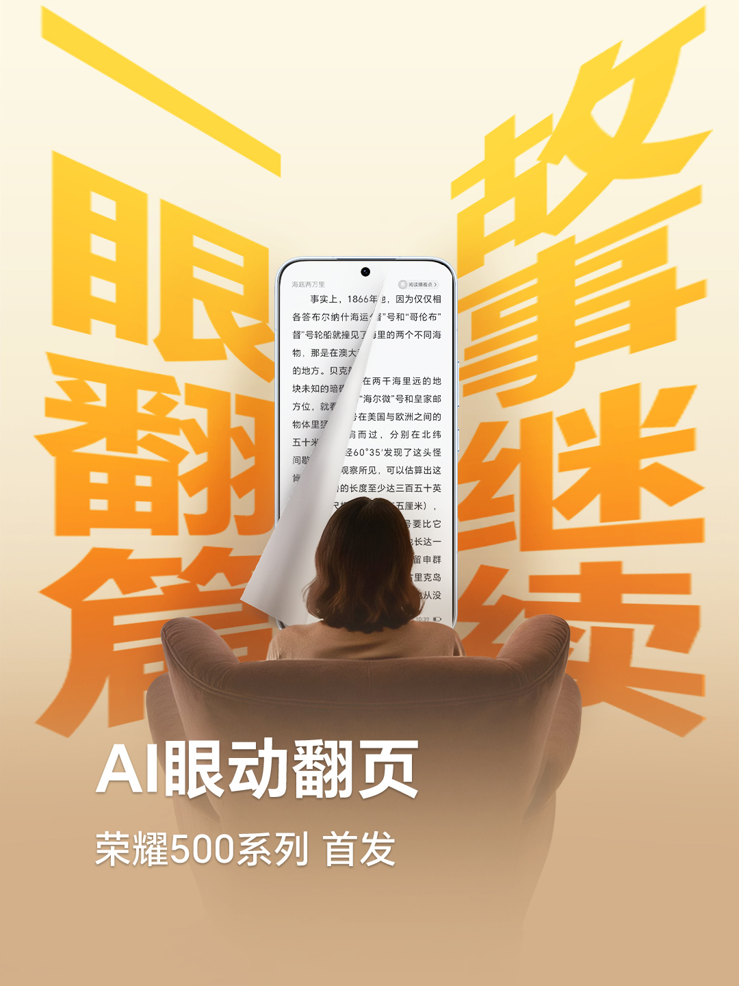 据荣耀 MagicOS 官方微博介绍,荣耀 500 系列首发 AI 眼动翻页功能,主流电子书都支持。