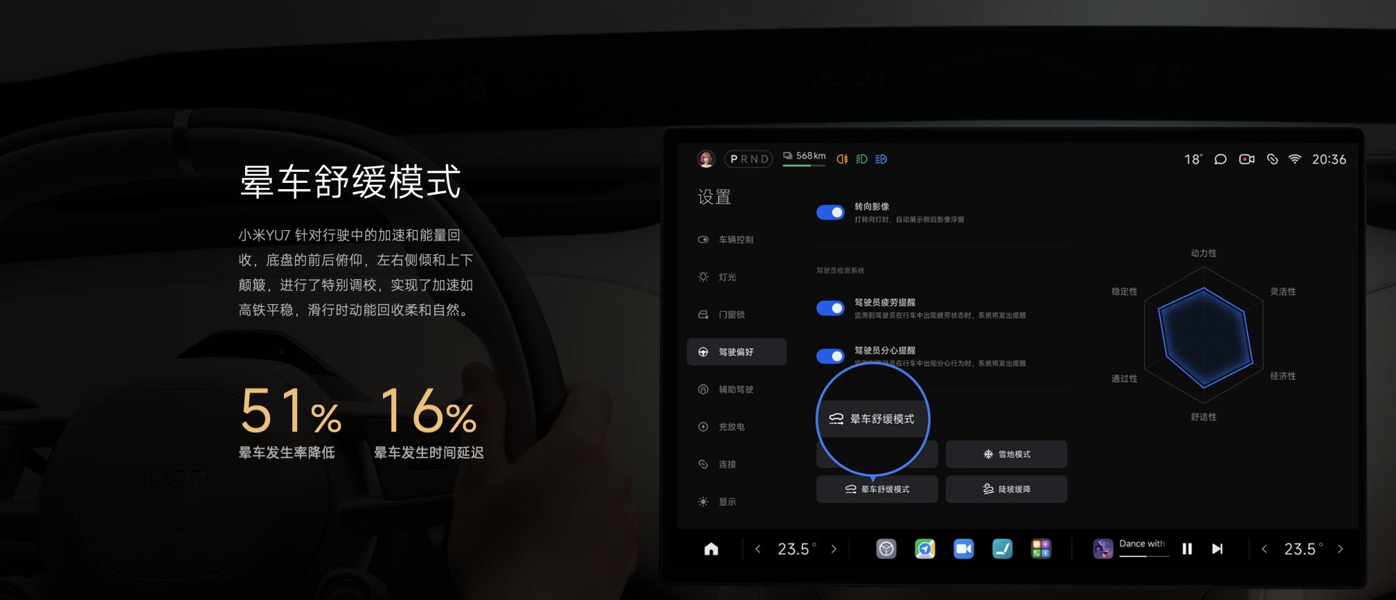 其中小米的表现尤为值得一说,作为唯一一家拥有自己新能源汽车的手机厂商,小米不但在手机系统里提供了晕车缓解功能,而且在自家汽车上搭载了晕车舒缓模式,其通过调整动力输出曲线、油门响应、能量回收力度、制动策略等手段,让车的加减速节奏更平、更线性,配合底盘悬架的调教,尽量减少车身的突然俯仰和横甩。