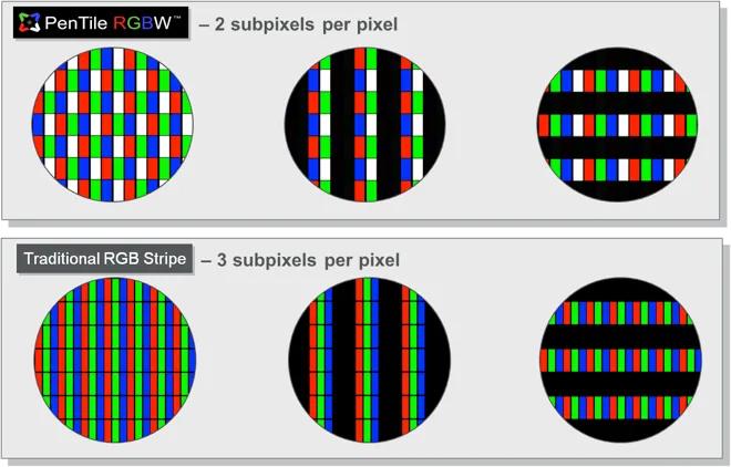 这是因为红、绿、蓝三色的子像素寿命不同,假如不使用这种方案,寿命最短的蓝色子像素会比红、绿子像素更快出现衰减,影响屏幕的显示效果。虽然经过数年时间的优化,Pentile钻石排列或类钻石排列已经解决了大部分问题,但仍存在文字边缘发虚等细节问题。