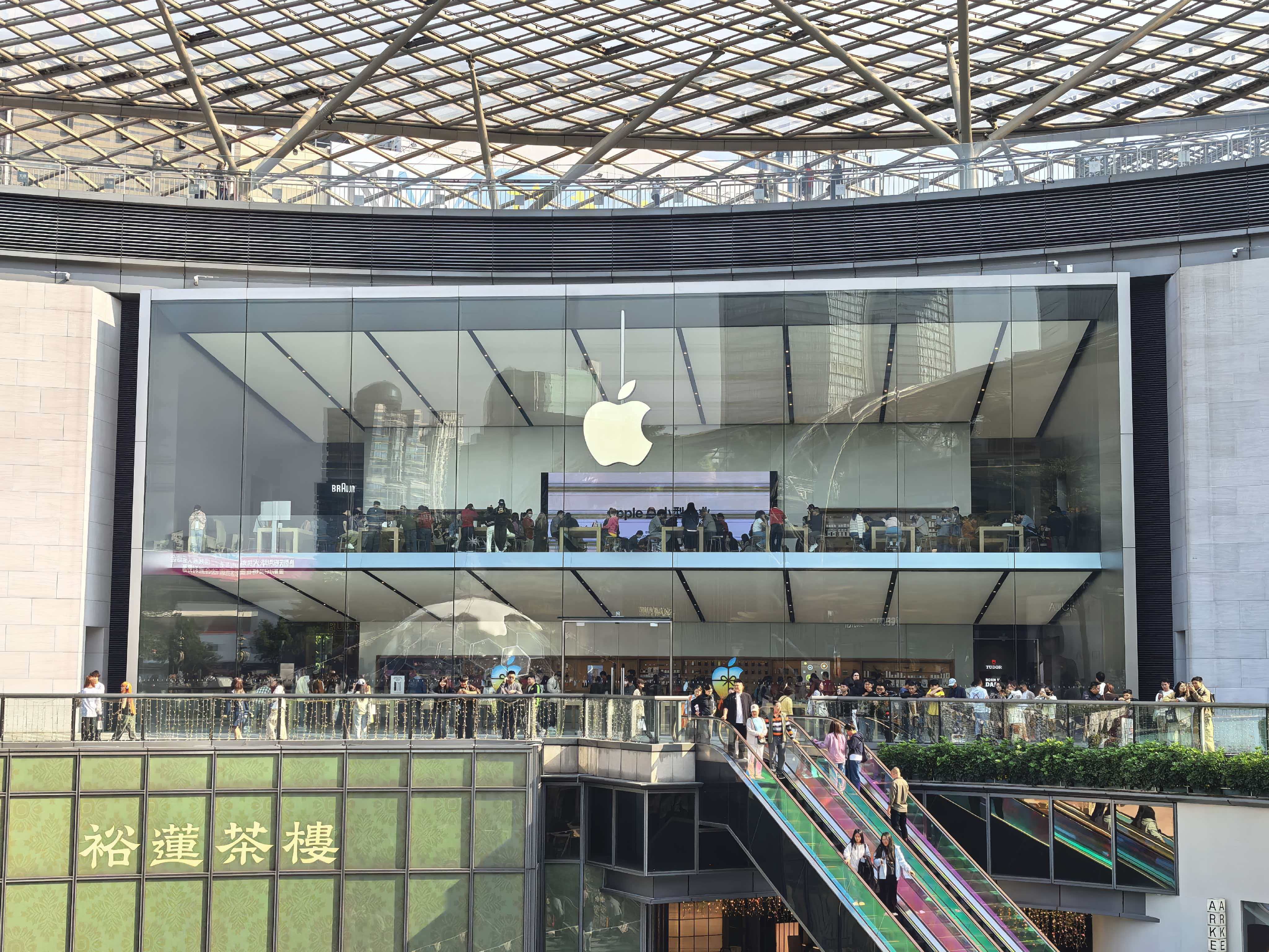 苹果在广州的第一家直营店落于天河区体育西路天环广场,由于临近圣诞节,天环广场开放了特殊的节日装饰,即使是工作日的中午依然很多路人拍照打卡。同样地,这样的热闹氛围也在Apple Store店内呈现。