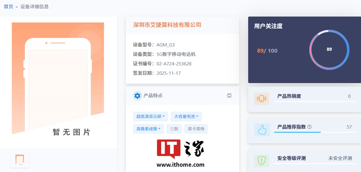 IT之家 12 月 10 日消息,AGM G3 三防手机已现身电信设备终端网,并通过工信部电信设备进网审核。新机支持 NR SA / NR NSA / TD-LTE/ LTE FDD 制式、5G-增强移动宽带(eMBB)技术、5G 异网漫游功能等。