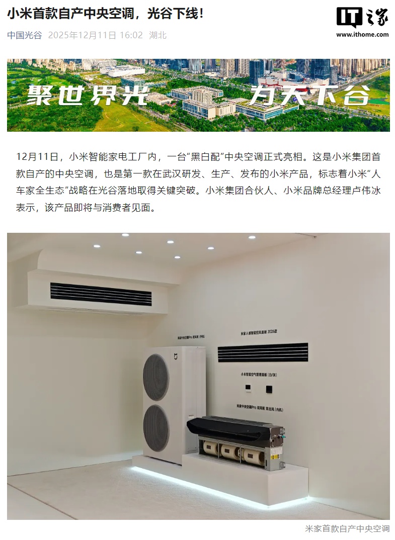 IT之家 12 月 11 日消息,小米首座大家电工厂 —— 武汉小米智能家电工厂一期已竣工投产,小米集团合伙人 / 总裁、手机部总裁、小米品牌总经理卢伟冰今日宣布,从这座智能家电工厂诞生的首款产品米家中央空调 Pro 双风轮即将亮相。